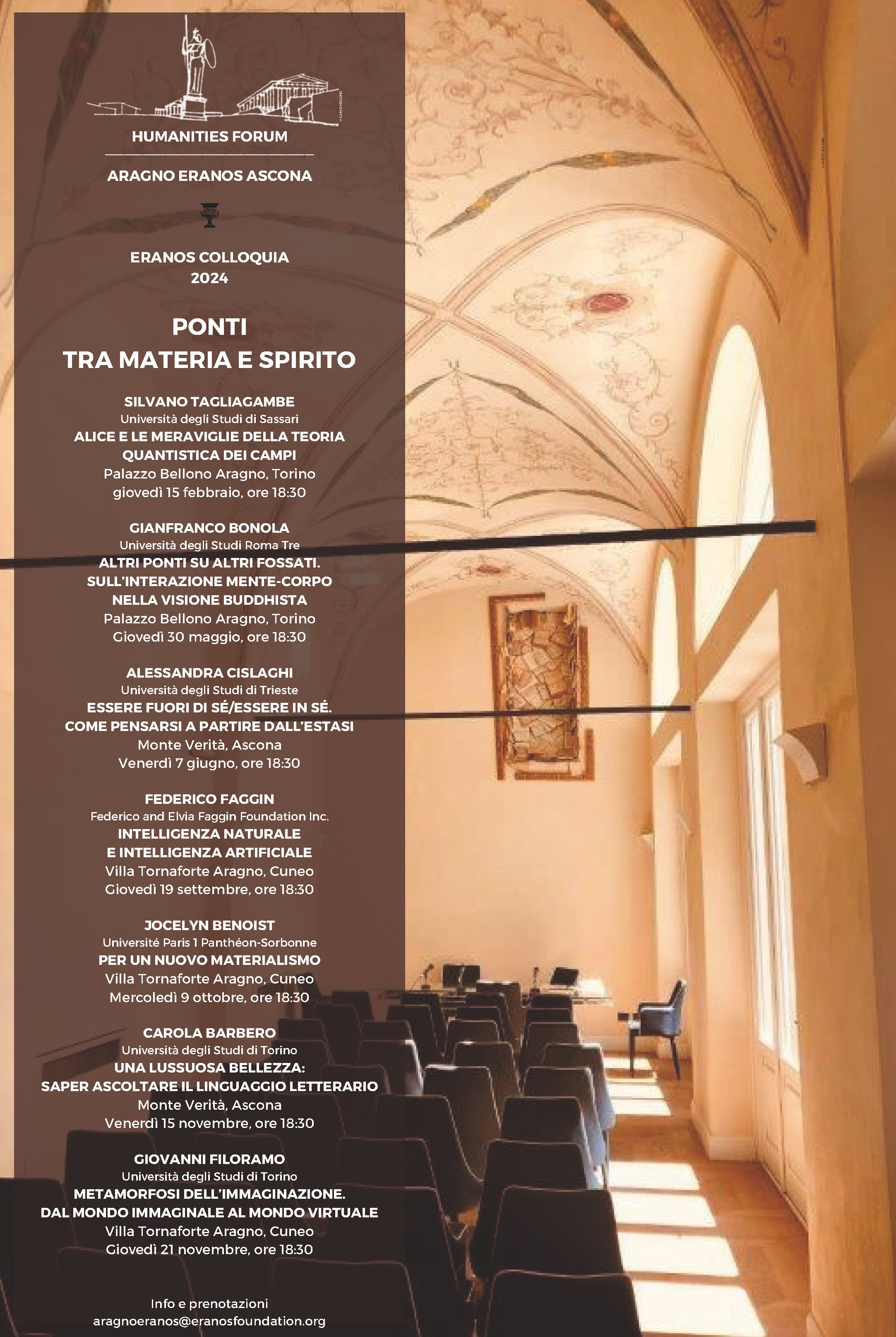 The Aragno Eranos Publishing House Ascona, in collaboration with the Eranos Foundation and Nino Aragno Publishing House, promotes for the first time a cycle of cultural meetings, between Switzerland and Italy, named Eranos Colloquia. The theme chosen for 2024 is "Bridges between Matter and Spirit," around which a number of leading specialists from humanistic and scientific disciplinary fields will speak.